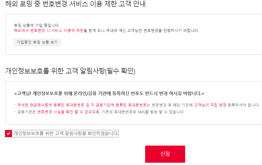 5. 페이지 아래쪽의 신청 버튼을 눌러 번호 변경을 완료한다. 신청 버튼을 누르면 바로 바뀌는건 아니고 아직 바꾸기 전 휴대폰 번호로 인증문자가 온다. 이 인증번호를 입력하고 진행하면 진짜 휴대폰 번호가 바뀐다.