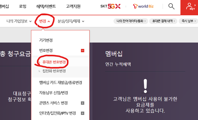 3. 우측 상단의 myT 버튼을 클릭하여 페이지 이동 후 상단 메뉴의 변경 > 번호 변경 > 휴대폰 번호 변경 메뉴를 클릭하여 번호 변경 페이지로 이동한다.