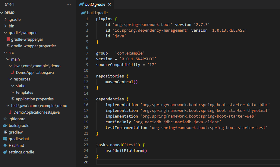 압축을 풀어서 Visual Studio Code를 이용해 폴더를 열어보면 다음과 같은 파일들이 존재하고 위에서 선택한 디펜던시들을 build.gradle (또는 pom.xml)에서 확인할 수 있다.