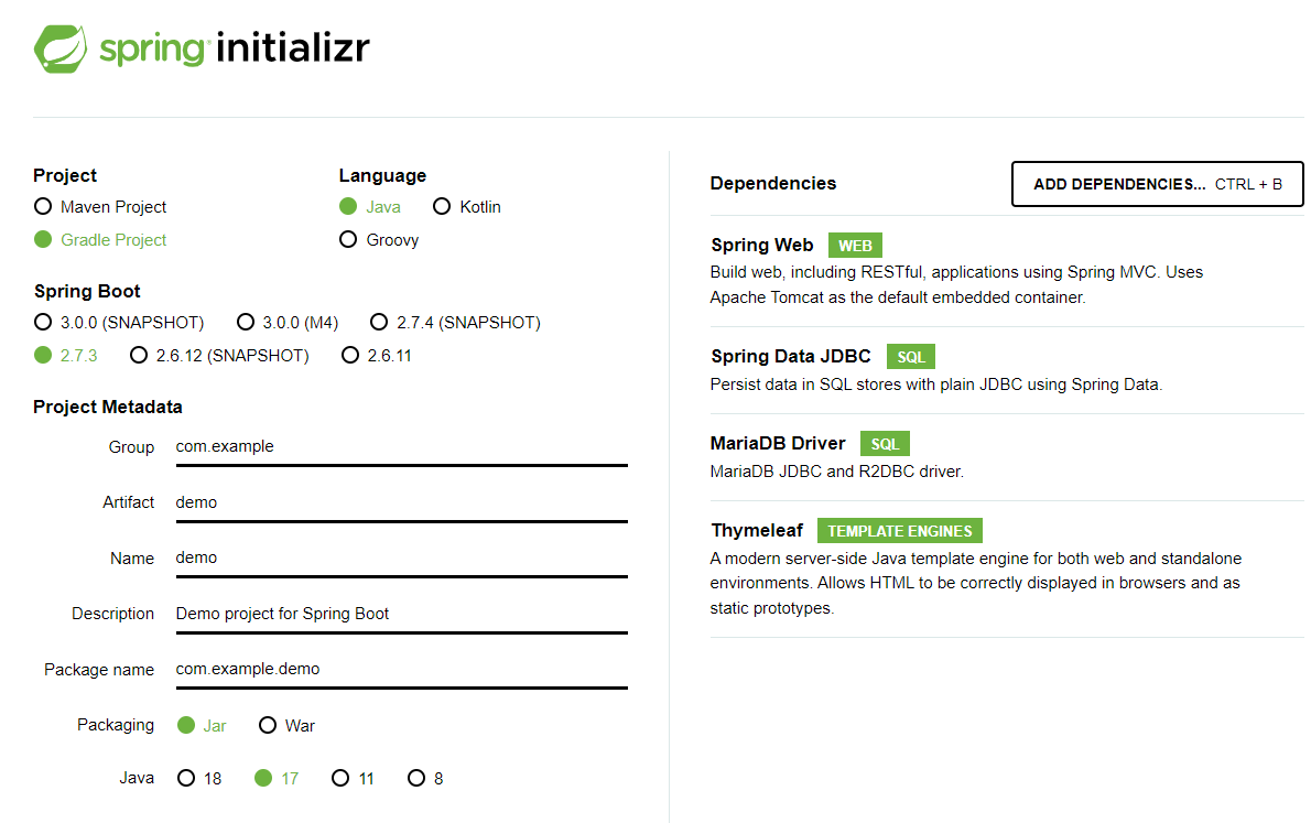 화면 오른쪽에서 Dependencies를 추가하여 진행할 수 있는데 Spring Web, Spring Data JDBC, MariaDB Driver, Thymeleaf 등 자신의 프로젝트에 필요한 항목을 선택하면 된다.