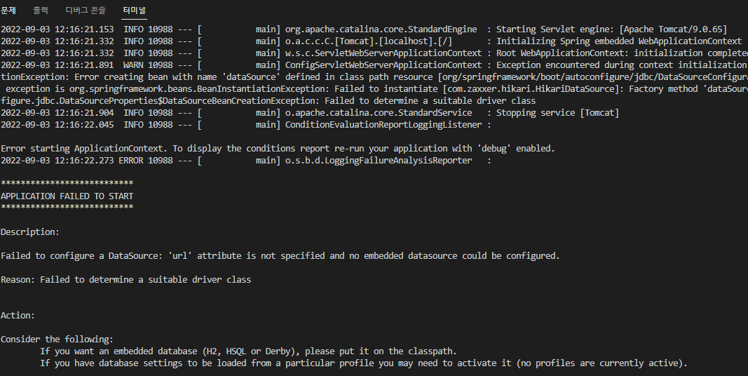 그냥 아무런 수정을 하지 않고 실행하면 다음과 같은 에러가 발생하는데 디펜던시 중에서 spring-boot-starter-data-jdbc를 추가해서 그런 것 같다.